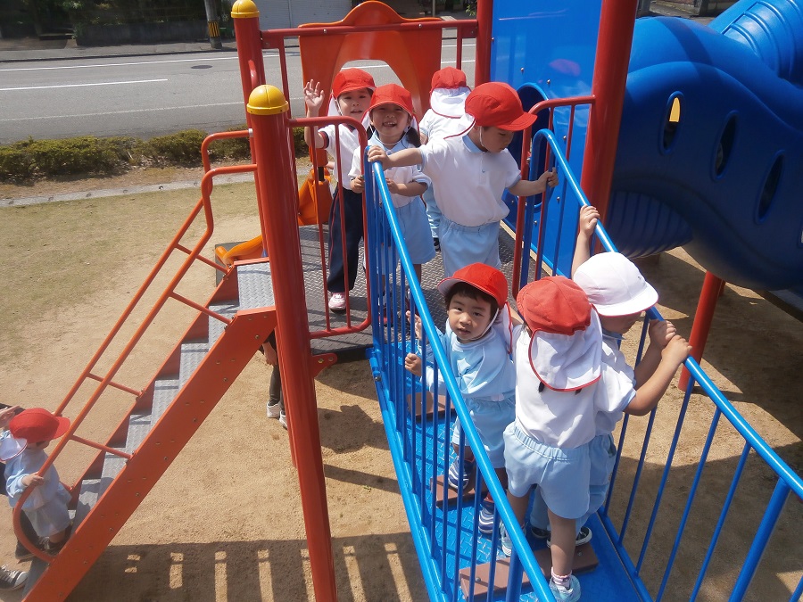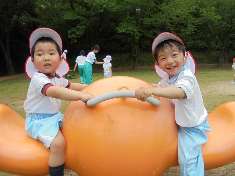 小さい組のお友達は、お兄ちゃん、お姉ちゃんに手を引いてもらって、薬勝寺池公園の遊具広場へ出発です!!