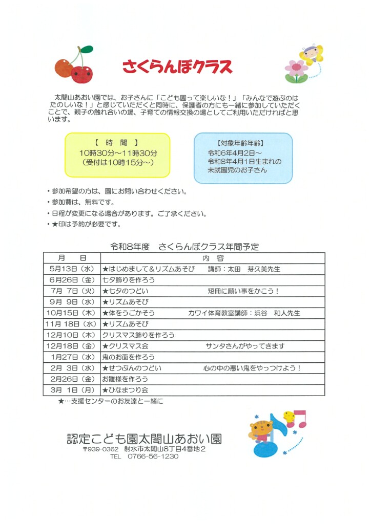 予定表PDFはこちら→ 令和8年度さくらんぼクラス予定表